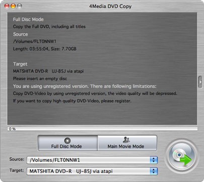 Bạn có thể lựa chọn sao chép toàn bộ nội dung đĩa DVD hoặc chỉ phần phim chính. Sau đó, thực hiện sao chép từ đĩa DVD-5 sang DVD-5, DVD-9 sang DVD-9, hoặc thậm chí nén DVD-9 thành một đĩa DVD-5 duy nhất. Đây là tất cả những gì bạn cần thực hiện với 4Media DVD Copy Mac.