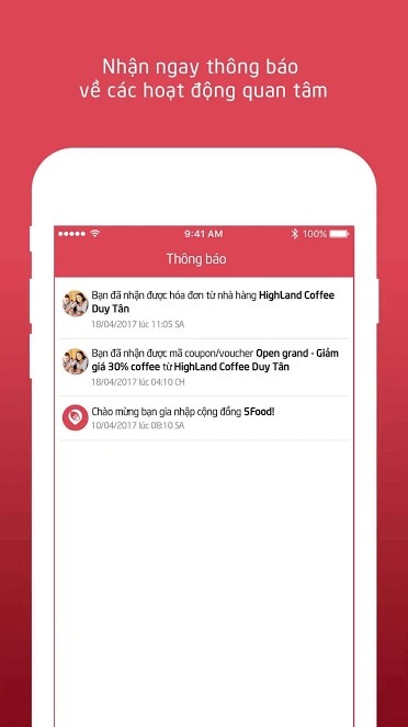 Hóa đơn chi tiết của các lần dùng bữa tại các nhà hàng liên kết với 5Food sẽ được gửi trực tiếp đến điện thoại của bạn ngay sau khi thanh toán hoàn tất.