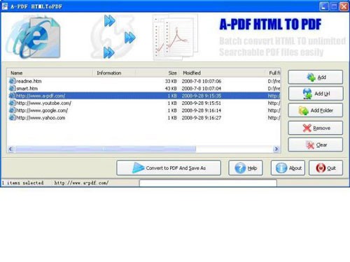 Đối với việc chuyển đổi hàng loạt file, chỉ cần kéo và thả các file HTML cần thiết vào danh sách, hoặc dán trực tiếp các URL và nhấp vào "Convert to PDF And Save as". A-PDF HTML to PDF sẽ thực hiện chuyển đổi nhanh chóng.