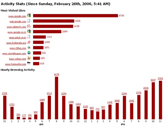 Activity Stats là một phần quan trọng của about:me, hiển thị đồ thị về các trang web bạn truy cập thường xuyên nhất. Thông tin này bao gồm danh sách các trang web cá nhân được ghé thăm nhiều nhất, cùng với biểu đồ thể hiện hoạt động duyệt web theo giờ trong ngày.