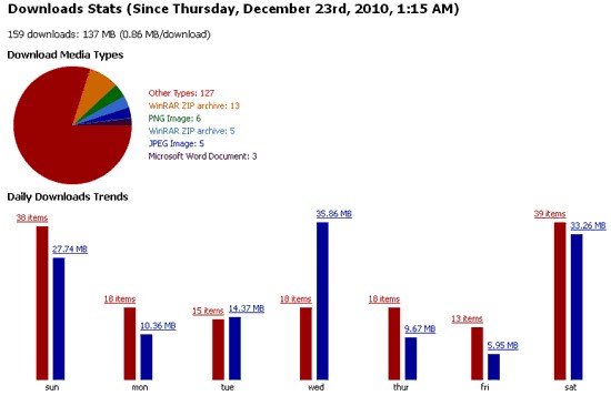 Downloads Stats cung cấp thông tin chi tiết về các loại tệp tin bạn tải xuống. Nó theo dõi xu hướng tải xuống hàng ngày, giúp bạn nắm bắt được các loại tệp tin phổ biến nhất mà bạn thường xuyên tải về.
