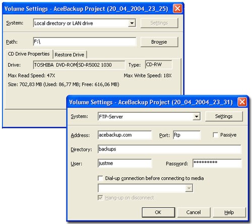 Acebackup cung cấp hai kiểu project chính: