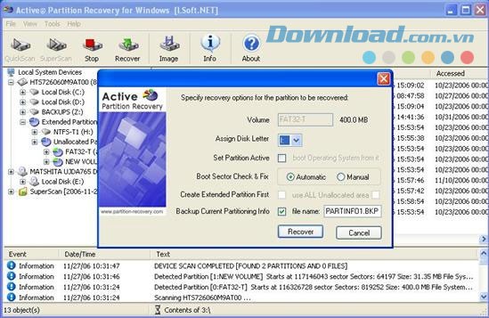 Active Partition Recovery hỗ trợ việc khôi phục partition của các ổ đĩa được định dạng với các hệ thống file phổ biến như FAT và NTFS.