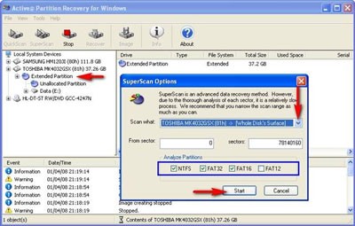 Trên hộp thoại SuperScan Options, bạn có thể chọn lại ổ đĩa ở mục Scan what. Bạn cũng có thể chọn vùng sector cần quét để giảm thời gian quét. Chọn các hệ thống file như FAT12, FAT16, FAT32, NTFS trong mục Analyze Partitions. Sau đó nhấp nút Start để bắt đầu quá trình quét.