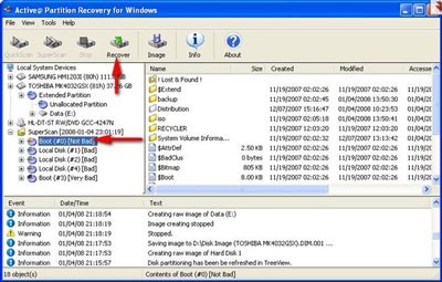Quá trình quét này diễn ra chậm, bạn có thể theo dõi thanh trạng thái để biết phần trăm công việc đã hoàn thành. Khi SuperScan hoàn tất, các partition tìm thấy sẽ được liệt kê trong mục SuperScan như hình dưới.