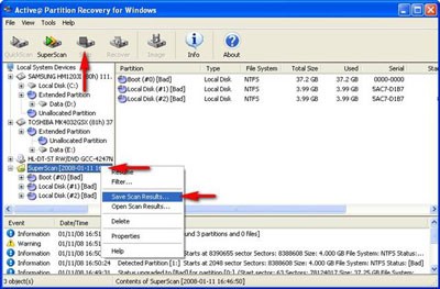 Lưu lại SuperScan results: Khi đang sử dụng SuperScan, muốn tạm dừng quét và lưu lại kết quả đã quét, bấm nút Stop trên thanh công cụ. Các partition đã quét được sẽ được hiển thị trong mục SuperScan. Chuột phải vào mục này, trên menu chuột phải, chọn Save Scan Results. Một hộp thoại sẽ xuất hiện cho phép bạn chọn tên file (đuôi .scn) và đường dẫn để lưu file kết quả.
