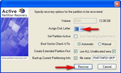 Trên hộp thoại Recover, chọn Assign Disk Letter là nhãn đĩa gán cho partition muốn khôi phục. Lưu ý chọn tính năng Backup Current Partitioning Info để tạo file .BKP. Sau đó nhấp nút Recover.