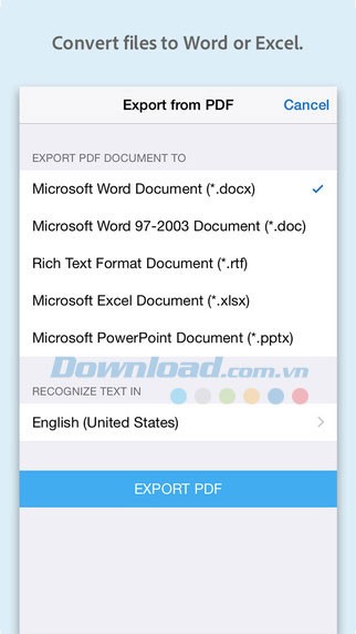 Hơn nữa, ứng dụng còn hỗ trợ tích hợp với Adobe Document Services, giúp bạn chuyển đổi và xuất tệp tin PDF một cách thuận tiện.