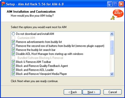 Những người dùng thường xuyên giao tiếp qua trình nhắn tin IM AIM có lẽ đã không ít lần cảm thấy khó chịu bởi sự xuất hiện của các quảng cáo trong giao diện chương trình. Trong khi Yahoo! Messenger (Y!M) có nhiều bản hack giúp loại bỏ quảng cáo, thì AIM lại có số lượng tùy chọn này hạn chế hơn.