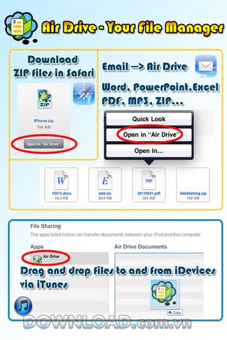 Air Drive – Your File Manager for iOS là một ứng dụng được thiết kế để biến chiếc iPhone, iPod Touch hoặc iPad của bạn thành một thiết bị lưu trữ không dây tiện lợi.