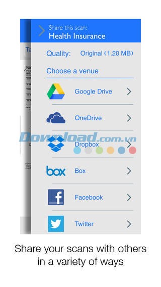 Sau khi scan, bạn có thể lưu bản scan dưới định dạng PDF hoặc file ảnh JPG. Việc chia sẻ trở nên đơn giản hơn bao giờ hết, thông qua email dưới dạng file đính kèm, các dịch vụ đám mây WebDAV, Air Drop, hoặc các tài khoản Dropbox , Box , iCloud , OneDrive , Google Drive .