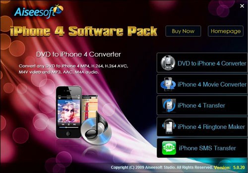 Aiseesoft iPhone 4 Software Pack là một bộ sưu tập đầy đủ các ứng dụng được thiết kế riêng cho iPhone 4, bao gồm: DVD to iPhone 4 Converter, iPhone 4 Movie Converter, iPhone 4 Transfer software, iPhone 4 Ringtone Maker, và iPhone SMS Transfer.