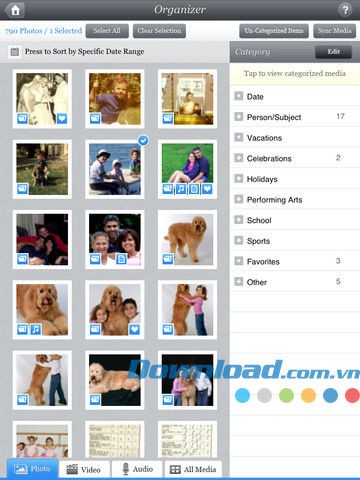 - Sắp xếp ảnh, video và bản ghi âm theo các danh mục do người dùng tùy biến.