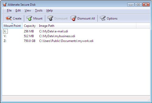 Với Aldenate Secure Disk, việc tạo các tập tin chứa được bảo vệ bằng mật khẩu trở nên đơn giản. Các tập tin này có thể được gắn kết (mount) thành ổ ảo và sử dụng như một ổ đĩa thông thường để lưu trữ những thông tin quan trọng.