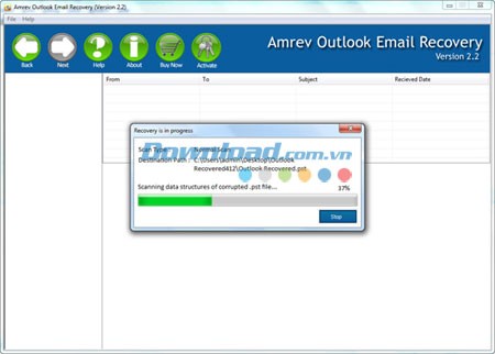 Chương trình Amrev Outlook Email Recovery sẽ bắt đầu quá trình quét, nhằm sửa chữa các lỗi trong file PST bị hỏng và phục hồi toàn bộ dữ liệu đã mất, bao gồm email, danh bạ, lịch hẹn, và các ghi chú khác. Dữ liệu phục hồi sẽ được lưu vào một file PST mới, như được thể hiện trong hình ảnh dưới đây.