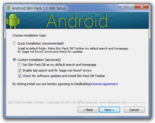 Bước tiếp theo cho phép bạn lựa chọn giữa cài đặt mặc định hoặc tùy chỉnh. Trong tùy chọn tùy chỉnh, bạn có thể loại bỏ các thành phần không mong muốn, chẳng hạn như việc đặt trang web của nhà phát triển Android Skin Pack làm trang chủ mặc định của trình duyệt, bật tính năng tự động cập nhật, hoặc cài đặt Skin Pack DB Toolbar. Sau khi điều chỉnh, hãy nhấn Next để chuyển sang bước kế tiếp.