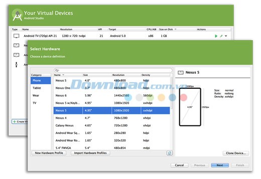 - Virtual Device Manager được cập nhật và sắp xếp lại cung cấp các hồ sơ cho các thiết bị Android phổ biến.