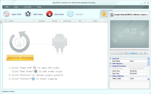 Any DVD Converter for Android là một ứng dụng tích hợp, kết hợp chức năng của Android DVD Ripper và Android Video Converter. Được thiết kế như một công cụ rip DVD chuyên dụng cho hệ điều hành Android, phần mềm này có khả năng trích xuất nội dung từ các đĩa DVD, bao gồm cả các folder DVD và đĩa DVD có cơ chế bảo vệ bản quyền, chuyển đổi chúng sang định dạng MP4 tương thích với nhiều thiết bị Android phổ biến như Google Nexus One, Sony Ericsson Xperia, HTC Desire và IS01.