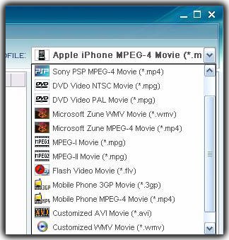 Tại menu sổ xuống profile ở góc trên bên phải, hãy chọn định dạng đầu ra mong muốn (mp4, mpg, wmv, avi, flv, 3gp...). Chương trình cung cấp các tùy chọn được tối ưu hóa cho các thiết bị phổ biến như iPhone, iPod, Sony, Microsoft, Mobilephone...