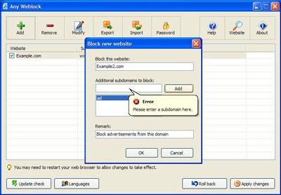 Việc thiết lập và cấu hình Any Weblock không đòi hỏi bất kỳ kiến thức chuyên môn nào về mạng máy tính. Bạn chỉ cần nắm rõ tên miền hoặc địa chỉ phụ (subdomain) của những trang web mà bạn muốn chặn.