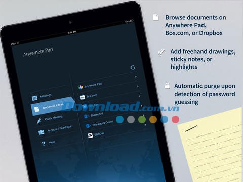 Anywhere Pad for iOS mang đến cho người dùng các thiết bị iPhone, iPad hoặc iPod Touch một ứng dụng hoàn toàn miễn phí, hỗ trợ đắc lực trong việc họp hành, trình bày và phối hợp công việc một cách di động.