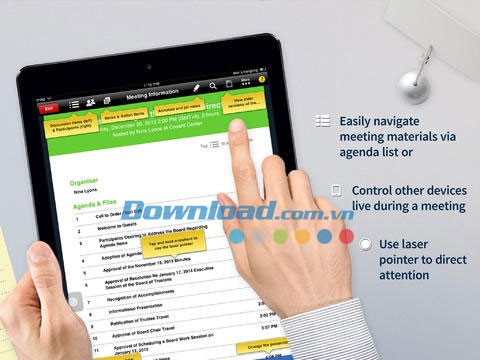 Cổng họp trực tuyến mạnh mẽ trong Anywhere Pad for iOS giúp thư ký và nhân viên hành chính dễ dàng hỗ trợ giám đốc và chuẩn bị các cuộc họp trực tuyến: