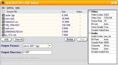 ApecSoft AVI 3GP Joiner (ASJ) là một giải pháp tuyệt vời trong trường hợp này. Đây là một công cụ đa năng, tích hợp cả hai chức năng: ghép nối các file video và chuyển đổi file đã ghép nối sang định dạng 3gp để xem trên thiết bị di động hoặc avi để xem trên máy tính.