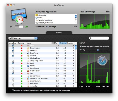 Tính năng AutoStop của App Tamer sẽ tự động dừng các ứng dụng không cần thiết, sau đó tự động khởi động lại chúng khi bạn mở chúng. Việc này giúp giải phóng tài nguyên CPU và giảm thiểu mức tiêu thụ điện năng.