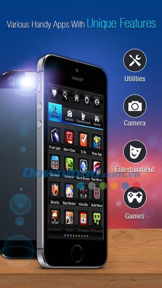 Ứng dụng cung cấp một loạt các công cụ hữu ích, bao gồm đèn pin sử dụng ánh sáng từ camera trước của thiết bị.