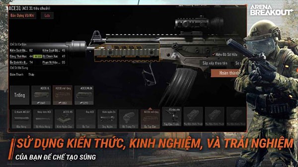 Arena Breakout VNG cung cấp một hệ thống Gunsmith hiện đại, cho phép người chơi tùy biến vũ khí một cách toàn diện. Với hơn 700 bộ phận vũ khí khác nhau, game thủ có thể tùy chỉnh ở 10 vị trí khác nhau trên súng.