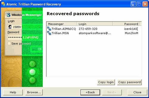 Atomic Trillian Password Recovery là phần mềm có khả năng hiển thị các thông tin đăng nhập và mật khẩu (đã được lưu trữ trên máy tính) cho nhiều dịch vụ nhắn tin tức thời khác nhau mà bạn có thể sử dụng cùng Trillian:
