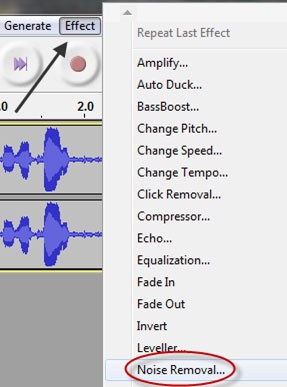 Hành động này giúp bạn chọn một mẫu ghi âm đại diện cho tiếng ồn nền, để Audacity có thể xác định và loại bỏ nó. Tiếp theo, chọn Effect, sau đó Noise Removal từ thanh menu chính.