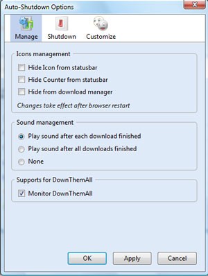- Manage: Thẻ này cho phép bạn thiết lập các tính năng liên quan đến quá trình tải dữ liệu, chẳng hạn như ẩn biểu tượng chương trình khi Firefox đang tải, cài đặt bộ đếm thời gian trước khi tắt máy, hoặc bật âm thanh thông báo khi quá trình tải file hoàn tất.