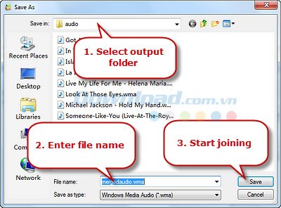 Tiếp theo, chọn vị trí lưu và đặt tên cho tập tin kết quả trong cửa sổ hiện ra. Cuối cùng, nhấn nút “Merge” để bắt đầu quá trình kết hợp các file audio.