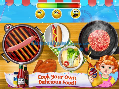 Hãy tự do yêu cầu các món ăn theo sở thích! Bạn sẽ được làm và phục vụ những món ăn ngon cho tất cả mọi người đến tham gia hội chợ, bao gồm xúc xích, bánh hamburger, bánh nướng nhỏ, kẹo, pizza Ý và các loại đồ uống khác nhau cùng với em bé mà bạn yêu thích.
