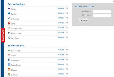 Backupify cho phép bạn sao lưu dữ liệu từ nhiều tài khoản khác nhau cho mỗi dịch vụ. Hãy nhấp vào liên kết "Manage" để khai báo thêm tài khoản.