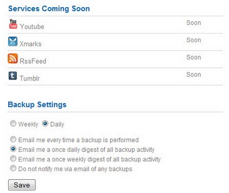 Trong tương lai, Backupify dự kiến sẽ hỗ trợ sao lưu dữ liệu cho thêm bốn dịch vụ khác là Youtube, Xmarks, RssFeed và Tumblr.