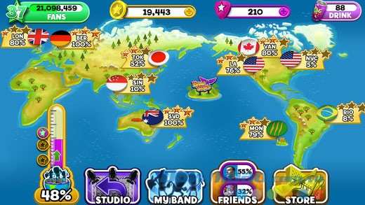 Band Stars đã mở rộng phạm vi hoạt động ra toàn cầu với chế độ chơi World Tour hoàn toàn mới. Hãy cùng ban nhạc của bạn khởi hành và chinh phục những thị trường âm nhạc đầy khó khăn như Tokyo, London hay New York. Tăng cường lượng người hâm mộ trên toàn thế giới và cạnh tranh với những người chơi khác trong cuộc đua để trở thành ban nhạc xuất sắc nhất thế giới!