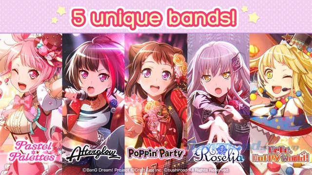 Nếu bạn là một fan của bộ phim BanG Dream, chắc chắn sẽ không thể bỏ qua Kasumi và những người bạn của cô. Tuy nhiên, trong phiên bản game này, họ sẽ được gia nhập bởi 4 ban nhạc đầy tài năng khác: Afterglow, Roselia, Pastel*Palettes và Hello, Happy World.