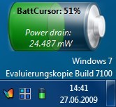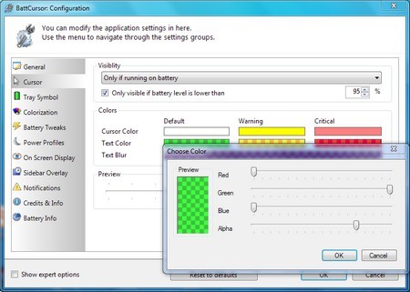 BattCursor cho phép tùy chỉnh màu sắc và độ trong suốt của chữ hiển thị, thay đổi theo mức pin hiện tại. Ví dụ, khi laptop được cắm sạc, chữ có thể hiển thị trong suốt, nhưng sẽ trở nên rõ ràng hơn khi máy hoạt động bằng pin và pin yếu.