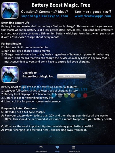 Mọi ý kiến đóng góp, báo cáo lỗi hoặc đề xuất tính năng mới cho các phiên bản tiếp theo của Battery Life Magic Free có thể được gửi trực tiếp đến nhà phát hành qua địa chỉ Email support@clearskyapps.com.