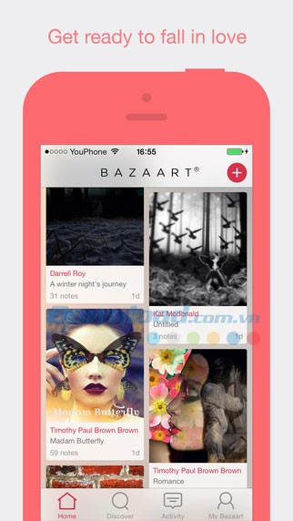 Kết nối và tương tác với những người dùng Bazaart khác bằng cách nhấn "Like", để lại bình luận hoặc theo dõi tài khoản của họ.