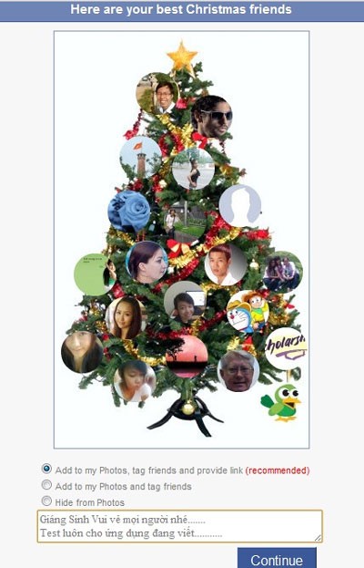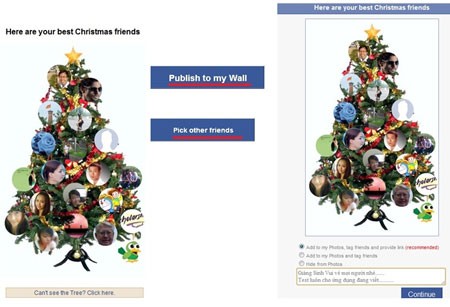 Lựa chọn Publish to my Wall sẽ tự động gắn thẻ một số ảnh bạn bè lên cây thông Noel và chia sẻ chúng trên trang cá nhân của bạn. Sau khi nhấn vào Publish to my Wall, hãy nhập một lời nhắn gửi đến bạn bè và nhấn Continue. Một cửa sổ pop-up sẽ hiển thị để bạn kiểm tra lại trước khi đăng tải lên Facebook. Cuối cùng, nhấn Publish để hoàn tất việc chia sẻ.