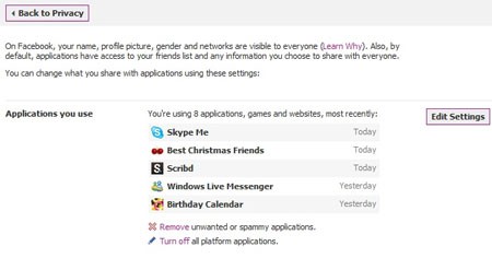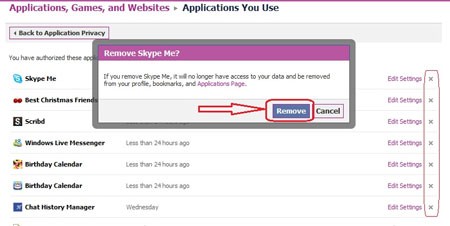 Tiếp theo, hãy nhấp vào liên kết dẫn đến bảng thiết lập. Sau đó, nhấn vào nút Edit Settings tại mục Application Privacy. Tại đây, bạn sẽ thấy danh sách các ứng dụng bạn đã thêm vào. Để gỡ bỏ, hãy nhấp vào biểu tượng gỡ bỏ nằm bên cạnh nút Edit Settings, sau đó nhấn Remove để xóa ứng dụng khỏi Facebook.