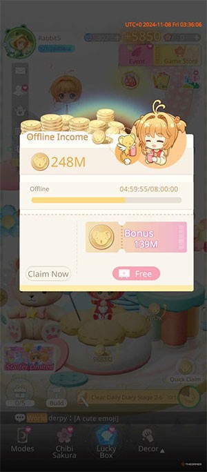 Tính năng Quick Claim cho phép người chơi thu thập toàn bộ xu từ các Chibi Sakura chỉ với một lần chạm duy nhất. Ngay cả khi bạn thoát khỏi trò chơi, lượng xu vẫn tiếp tục được tích lũy, miễn là bạn đăng nhập lại sau mỗi 8 giờ. Tuy nhiên, số lượng xu tích lũy sẽ không vượt quá giới hạn cho phép. Bên cạnh đó, đừng quên mở ví xu hàng giờ để nhận thêm xu Tomoeda, tối đa 3 lần mỗi ngày.