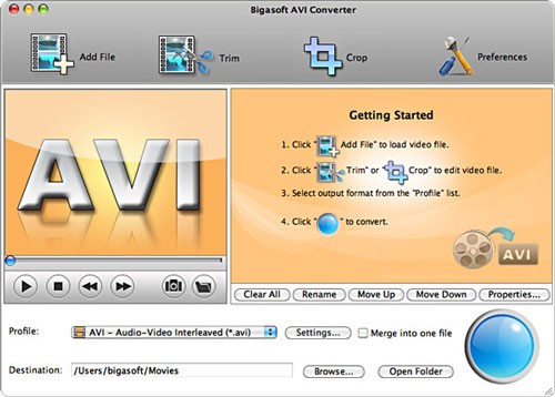 Bigasoft AVI Converter for Mac là một ứng dụng được thiết kế chuyên dụng để chuyển đổi video sang định dạng AVI, bao gồm cả video AVI chất lượng cao (HD), h.264 AVI, DivX video AVI, DivX HD video AVI, XviD video AVI và XviD HD video AVI.