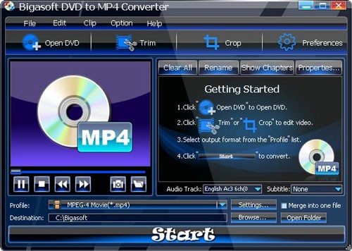 - Chuyển Đổi DVD sang MP4: Bigasoft DVD to MP4 Converter thực hiện việc chuyển đổi DVD sang MP4 (MPEG-4) một cách dễ dàng, mang lại chất lượng cao, tốc độ nhanh và kích thước file được tối ưu.