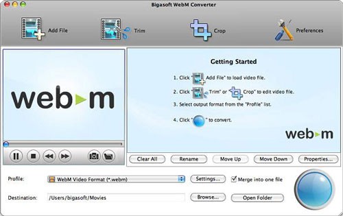 Nhờ sự hỗ trợ của Bigasoft WebM Converter for Mac, việc tạo ra các file WebM, HD WebM trở nên đơn giản và nhanh chóng hơn bao giờ hết. Phần mềm cho phép chuyển đổi từ hầu hết các định dạng video phổ biến hiện nay, bao gồm MP4, AVI, 3GP, FLV, MKV, H.264, RM, RMVB, VOB, SWF, Xvid, DivX, HD, AVCH, MTS, TS, WMV, M1V, M2V, MPG, DV.