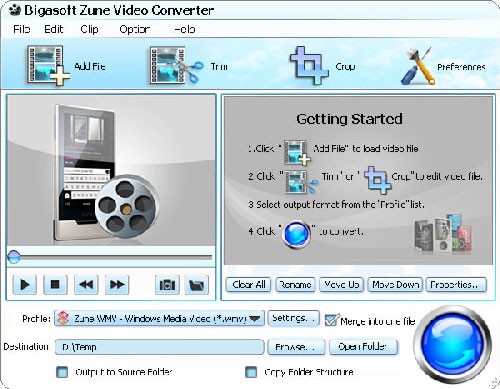- Chuyển đổi sang Zune: Bigasoft Zune Video Converter giúp bạn dễ dàng đồng bộ hóa bộ sưu tập phim yêu thích của mình với các thiết bị Microsoft Zune HD, Zune 120, Zune 80, Zune 16, Zune 8 và Zune 4.