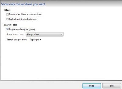 Trong giao diện chính, chọn mục Filter từ menu bên trái. Đánh dấu vào tùy chọn Begin searching by typing. Tại mục Show search Box, hãy chọn Always show, sau đó nhấn Hide để đưa phần mềm về lại khay hệ thống.